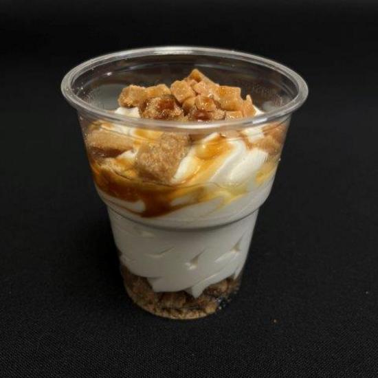 Gevuld met frisse opgeklopte yoghurt, caramelblokjes en caramel siroop