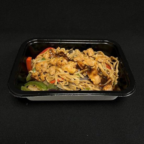 Gevuld met fijne pasta, groentemix, kruiden, ketjap sesam saus & kippendij